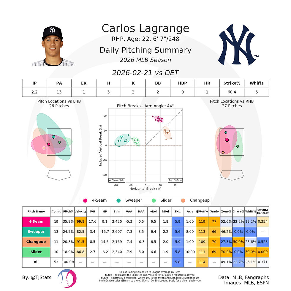 Lagrange featured nearly four 110+ stuff+ pitches (the changeup registered at 109), with the fourseamer grading out as a 77 offering in today’s outing. While the swing/miss wasn’t there, we got to see everything you’d ideally envision in a great first of the season, Spring Training outing. Lagrange frequently started batters off with his gyro slider at the top of the zone, registering 7 called strikes on 14 pitches. It was easily the best pitch Lagrange had going for him today, both his sweeper and gyro slider worked well at getting strikes and keeping hitters fooled. His bread and butter changeup didn’t net the best results considering it was the pitch Corey Julks pulled to left for a solo shot, but the shape was excellent, he sat 91-92 on the pitch, and it got good chase and decent whiff.